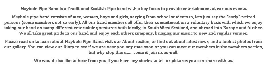Join the Band Maybole Pipe Band are looking for new members to help keep the Band active in the local community and would be interested in hearing from anyone interested in joining. People of any age wanting to learn a new instrument or people already with experience are welcomed to come along and join in on what is a great team of people. As can be seen from our diary we have a variety of different entertaining functions but no competition work. If you are interested in coming along contact us or visit our Contact section for more information.
