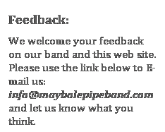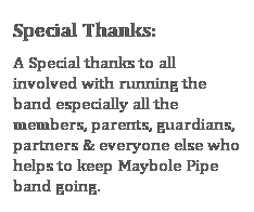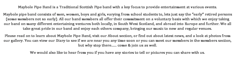 Join the Band Maybole Pipe Band are looking for new members to help keep the Band active in the local community and would be interested in hearing from anyone interested in joining. People of any age wanting to learn a new instrument or people already with experience are welcomed to come along and join in on what is a great team of people. As can be seen from our diary we have a variety of different entertaining functions but no competition work. If you are interested in coming along contact us or visit our Contact section for more information.